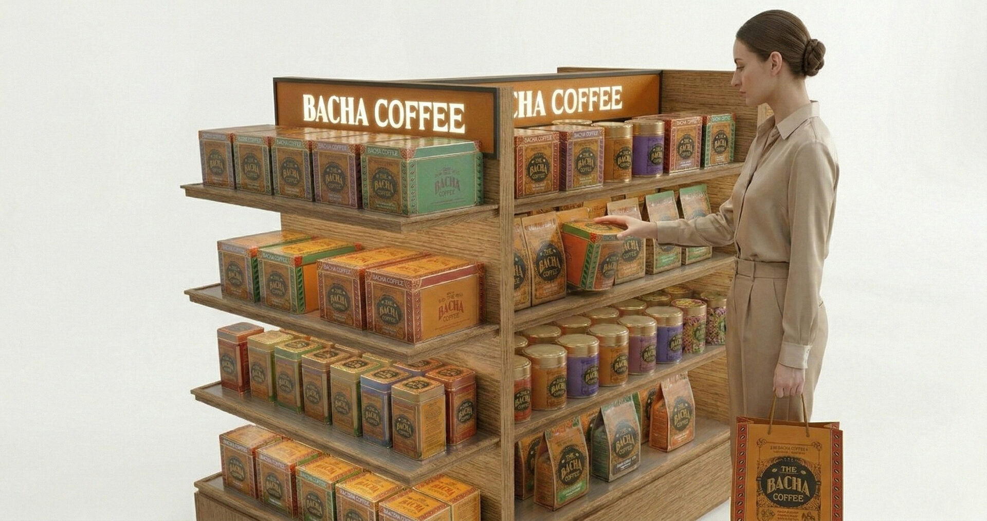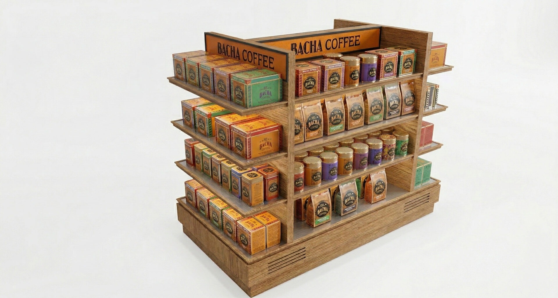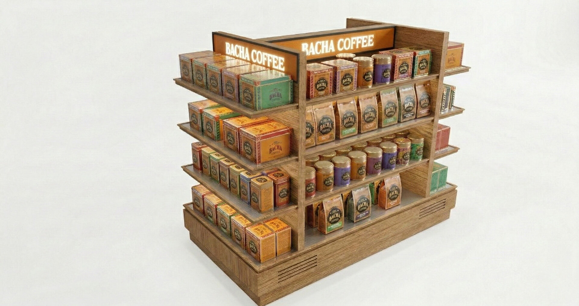 This duty-free display unit is designed as a self-contained purchase funnel: it captures brand attention first with an illuminated header, converts that attention into immediate gift-led pickup through front-facing boxed SKUs, and then supports deeper assortment exploration and upsell via pouches and jars across the mid-level shelves. Its 360° island layout removes approach constraints in high-traffic airport environments, keeping the brand legible from multiple sightlines without excessively blocking adjacent circulation.