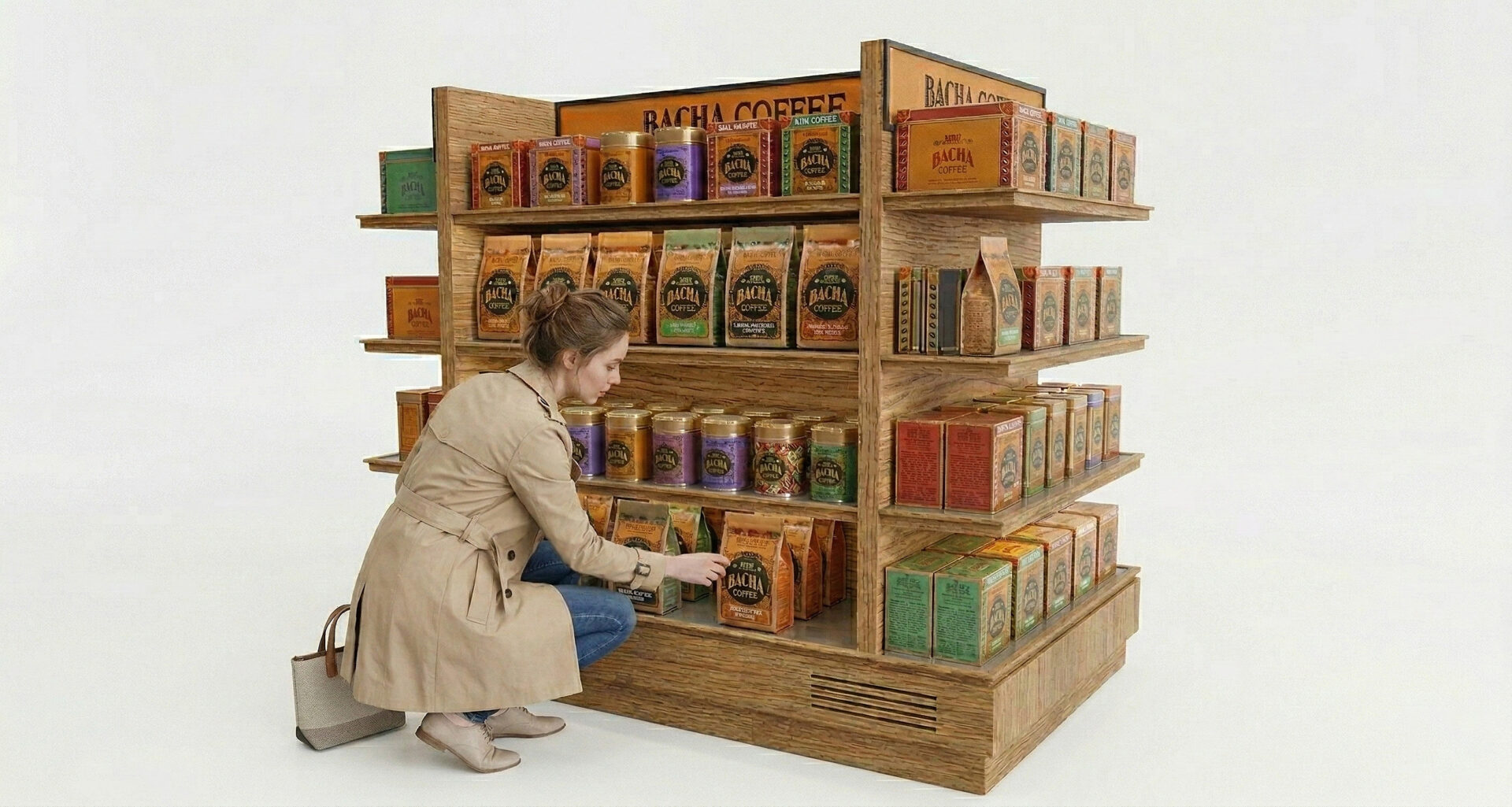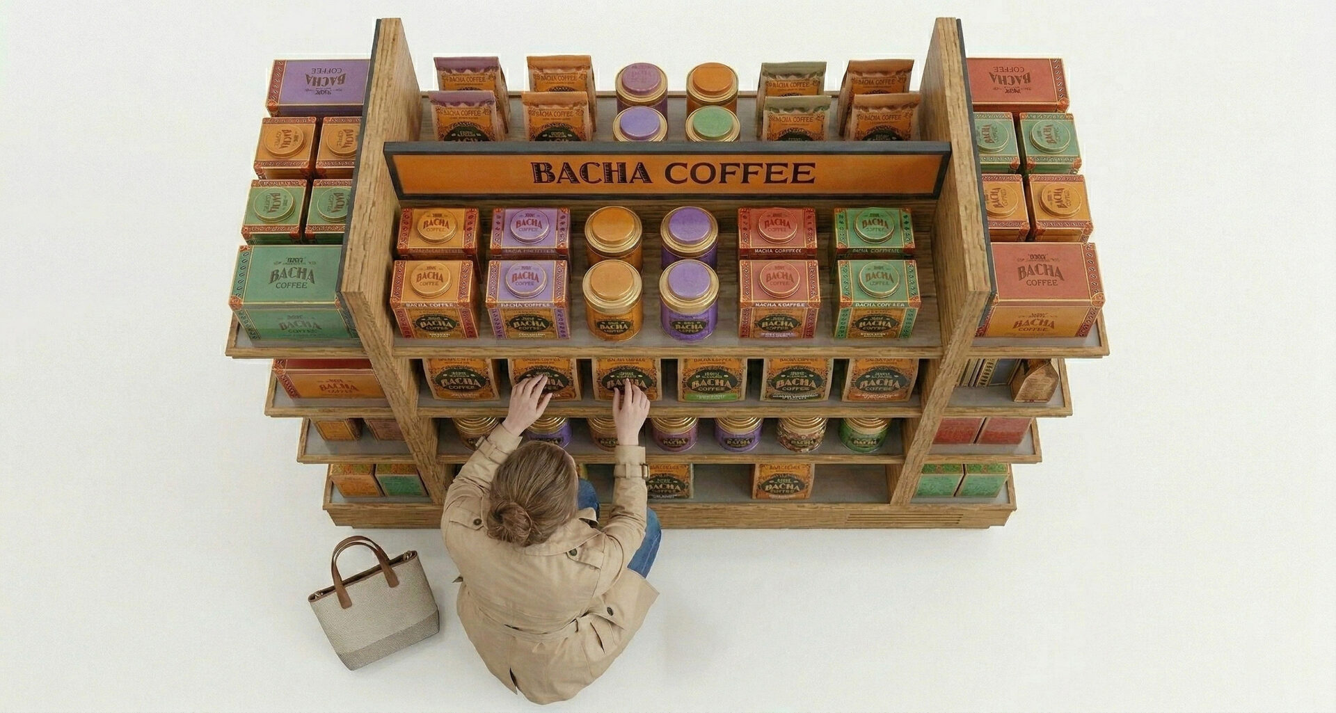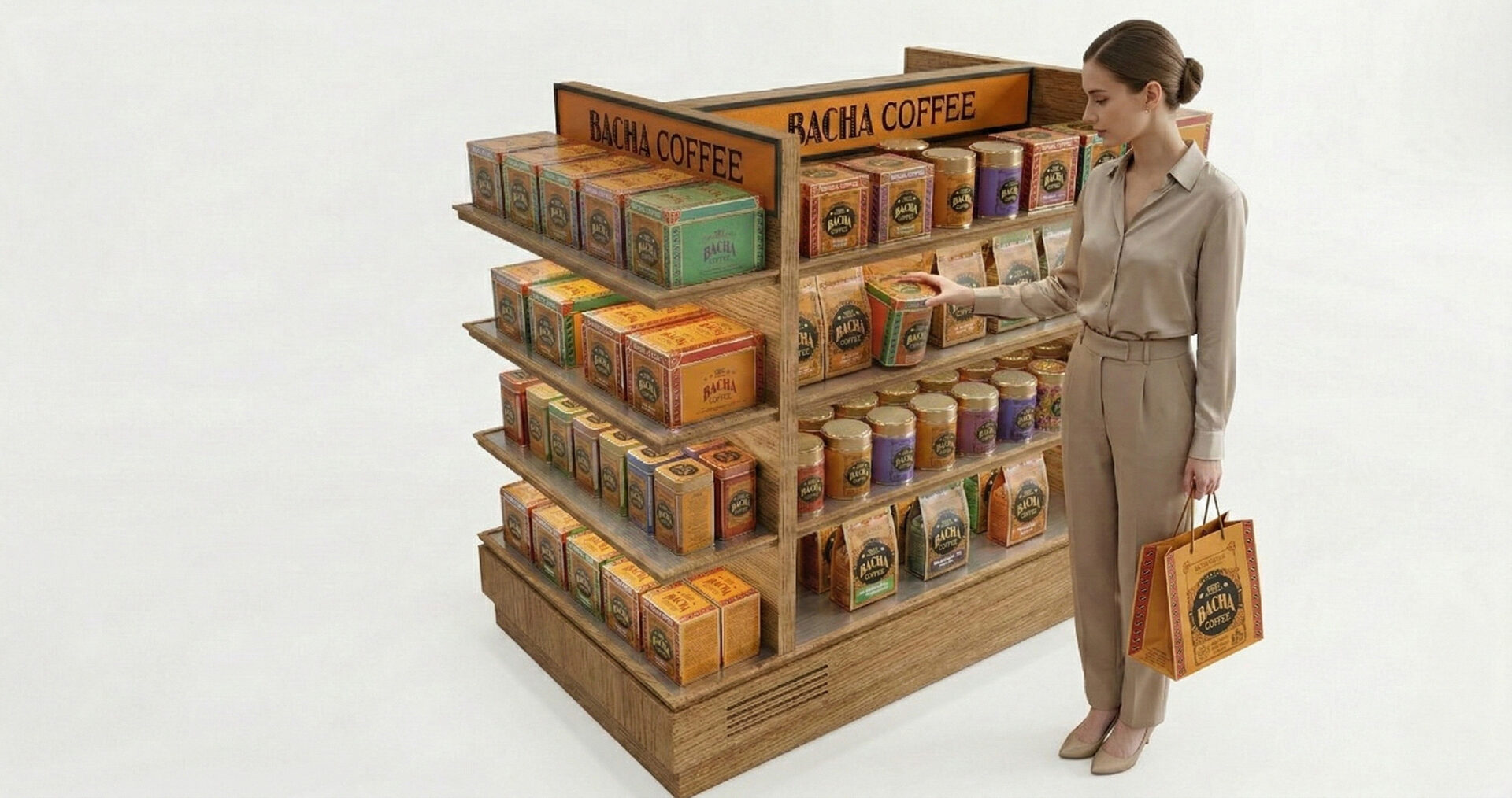 This duty-free display unit is designed as a self-contained purchase funnel: it captures brand attention first with an illuminated header, converts that attention into immediate gift-led pickup through front-facing boxed SKUs, and then supports deeper assortment exploration and upsell via pouches and jars across the mid-level shelves. Its 360° island layout removes approach constraints in high-traffic airport environments, keeping the brand legible from multiple sightlines without excessively blocking adjacent circulation.