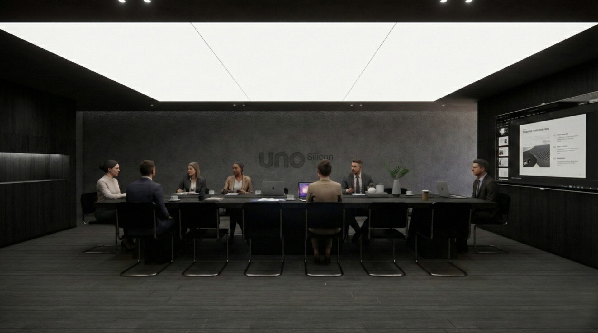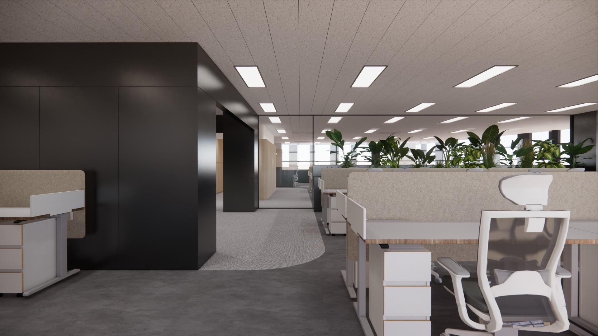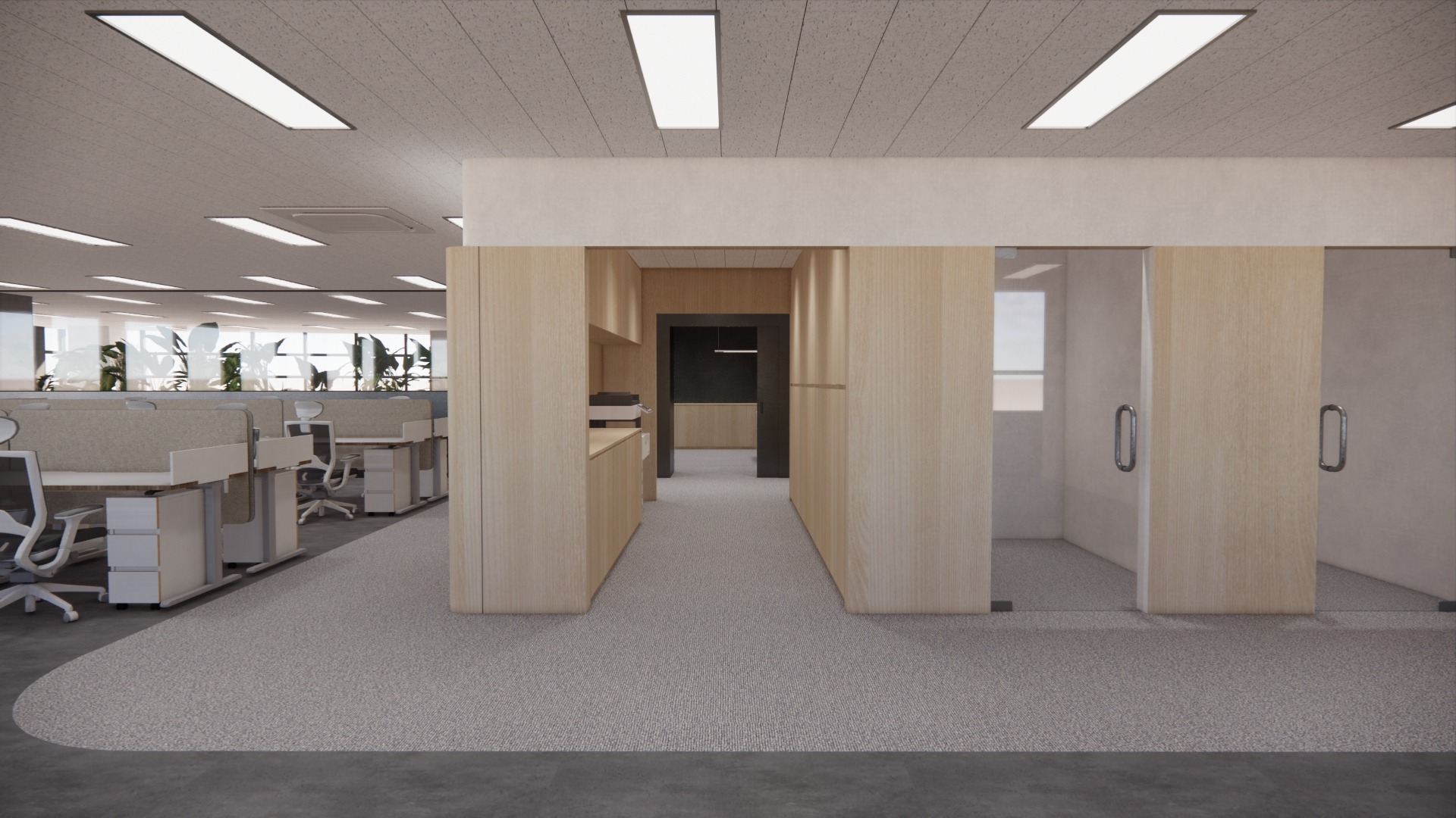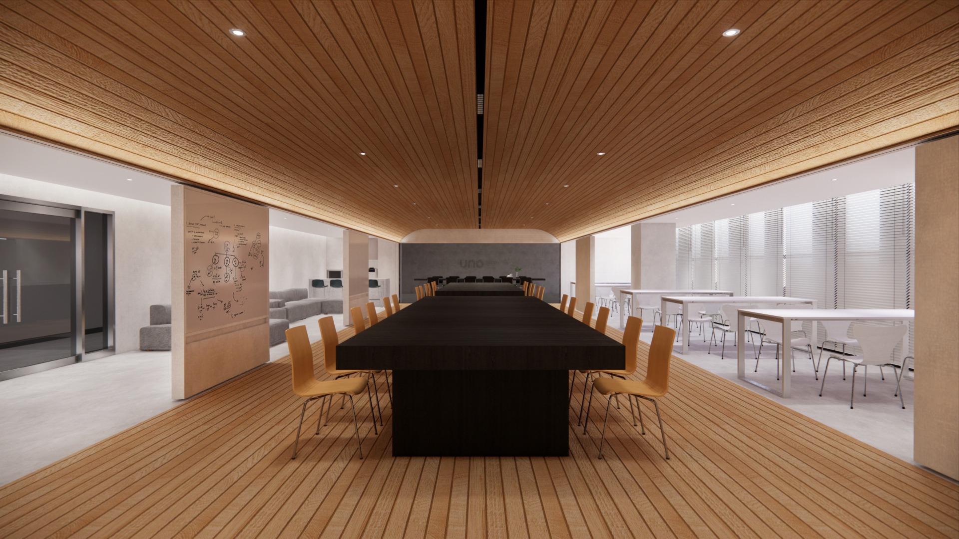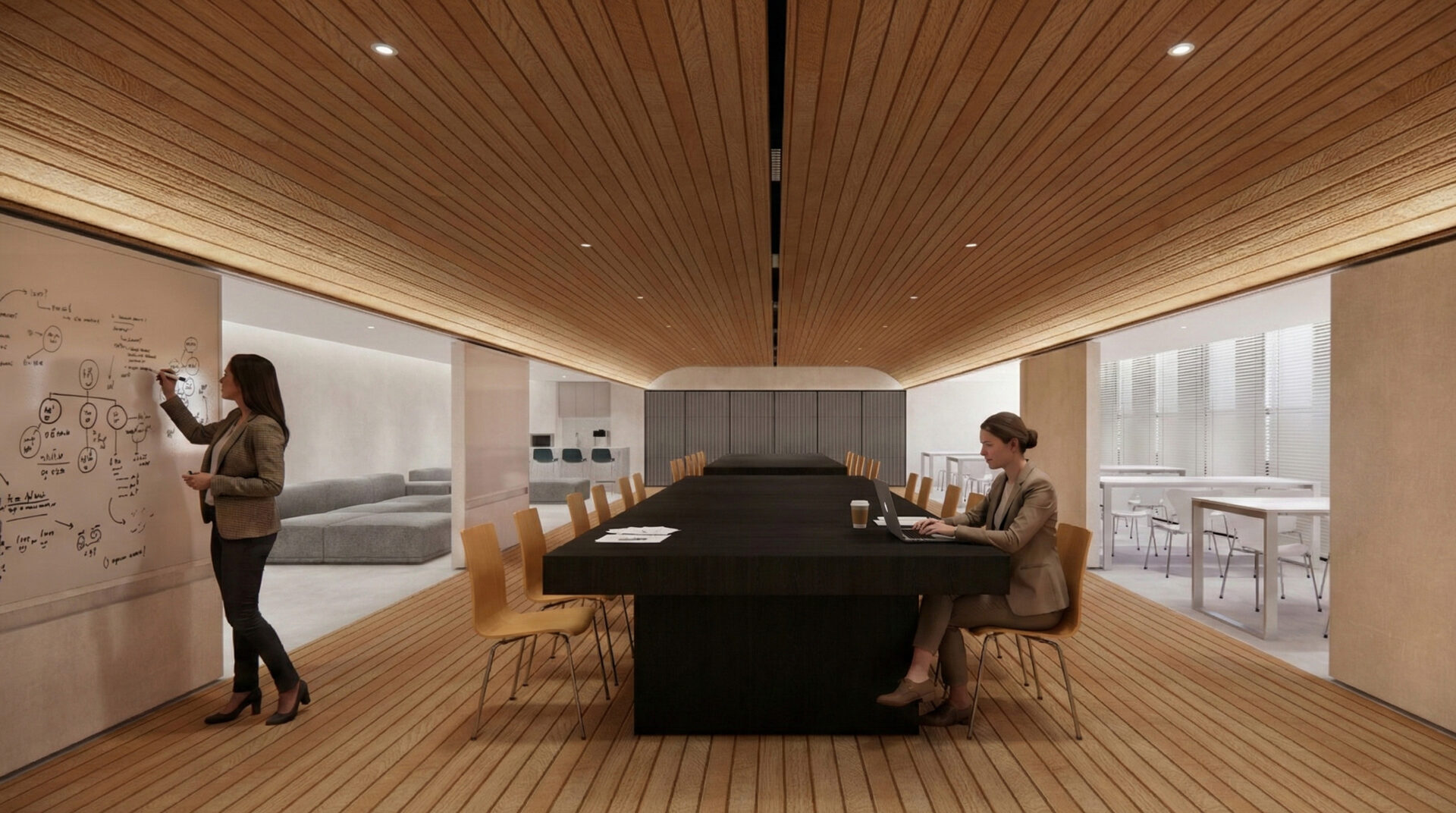 At the heart of the space, an elongated table and a linear ceiling canopy establish a clear axis—linking meeting, work, and lounge scenes into one continuous flow. Warm timber tones and restrained finishes create calm clarity, while a darker, focused room brings presence to key discussions and presentations.